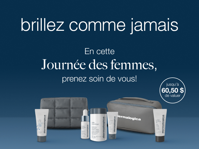 Offre valable pour une durée limitée, jusqu’à épuisement des stocks. À l’occasion de la Journée internationale des femmes, dépensez 169 $ ou plus et recevez votre choix de trois formats d’essai parmi une sélection prédéfinie, ainsi que votre choix d’une trousse de toilette de voyage, à sélectionner à la caisse. Les formats d’essai offerts incluent Special Cleansing Gel, Oil to Foam Total Cleanser, Daily Microfoliant, Circular Hydration Serum ou Active Moist. Les options de trousse de toilette incluent la trousse de voyage dermalogica ou la trousse de toilette matelassée Puffy. Limite d’un ensemble promotionnel par commande. Valeur totale pouvant atteindre 60,50 $. Offre valide sur les achats admissibles effectués au Canada sur dermalogica.ca du 7 mars 2026 à 0 h 00 (HE) au 16 mars 2026 à 23 h 59 (HE). Ne peut être combinée avec aucun coupon, rabais ou autre offre promotionnelle, appliquée à des achats antérieurs ni échangée contre de l’argent ou un crédit marchandise. Les cadeaux ne sont pas transférables, non remboursables, non négociables et ne peuvent être échangés, retournés ni convertis en argent ou en crédit marchandise. Nous nous réservons le droit de modifier, d’annuler ou de limiter cette promotion ou cette offre en tout temps, ainsi que d’apporter des modifications aux présentes conditions générales à tout moment et pour quelque raison que ce soit. Les offres ne peuvent être combinées et sont sujettes à changement.
