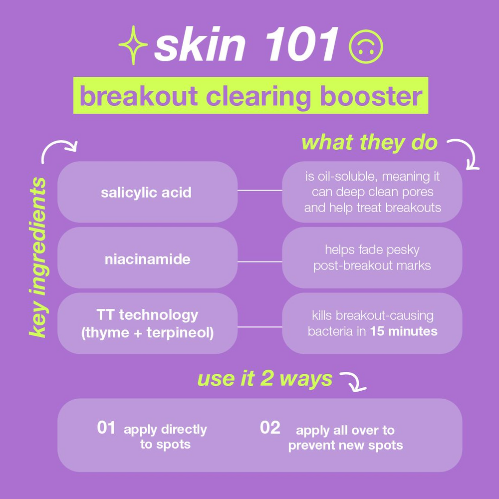Clears breakouts fast! Use daily a.m. + p.m. as needed. This fast-acting booster, formulated with Salicylic Acid, helps combat breakout-causing bacteria for rapid skin clearing. TT Technology and Phytoplankton Extract work with skin’s natural microbiome and help prevent over-drying.