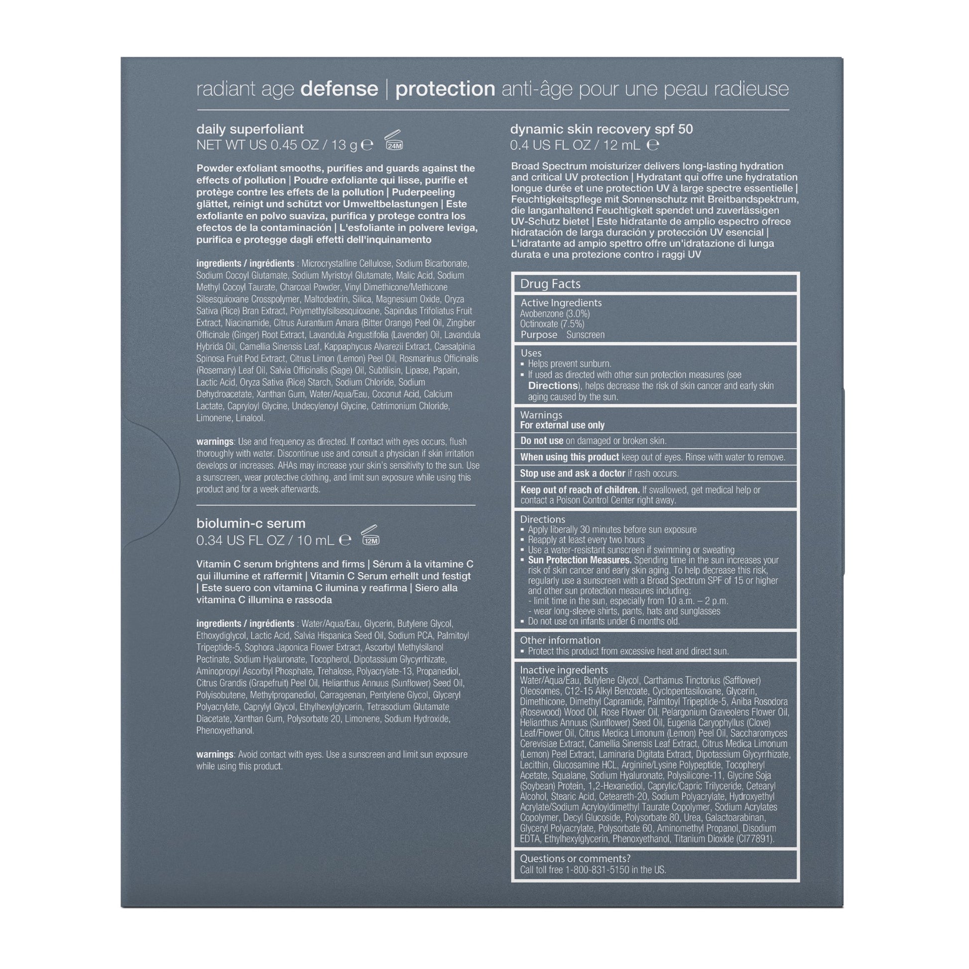 After cleansing, dispense about a half-teaspoon of Daily Superfoliant into very wet hands and create a creamy paste by rubbing hands together. Apply to face in circular motions, avoiding the eye area. Massage gently for one minute, then rinse thoroughly with warm water. Dispense a full dropper of Biolumin-C Serum and smooth over cleansed face and neck. Follow with Dynamic Skin Recovery SPF50 in the day and your favorite night time moisturizer in the evenings.