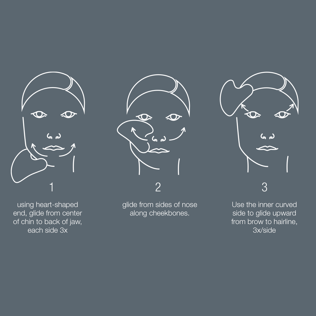 Step Three: Finally, using the gua sha, glide in upward motions over your face, neck, and chest for a smoothing effect, ensuring the serum and cream provide a slick surface for optimal movement.
